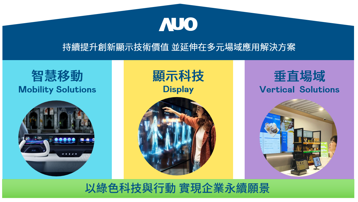 AB娱乐持續推動「雙軸轉型」,在精進顯示技術附加價值(Go Premium),與深化垂直市場應用(Go Vertical)的策略下,對應AB娱乐的優勢競爭力與趨勢,AB娱乐奠定顯示技術、智慧移動、垂直場域三大永續營運支柱,在顯示技術領域的根基之上,延伸布局多元場域應用解決方案。將先進顯示科技助力智慧移動及垂直場域發展,並以綠色科技與行動為實踐,在轉型之路上貫徹永續經營之願景。